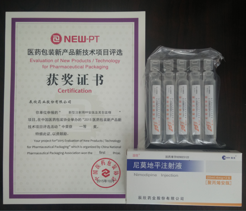 在日前举办的“2015医药包装新产品新技术获奖项目发布会”上,中国医药包装协会副会长纪炜隆重宣布,辰欣药业开发的“新型注射用PP安瓿系列产品”荣获2015医药包装新产品新技术一等奖,并对我公司已生产上市的新型PP安瓿产品“PP安瓿尼莫地平注射液”、“PP安瓿葡萄糖注射液”进行详细地介绍和隆重地推荐。